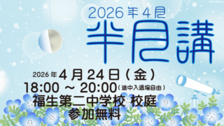 イベント2026年3月半月講 半月といっしょに、星空を見上げてみませんか。お月見というと満月が定番ですが、半月はクレーターを観察しやすく、満月とはまた違った表情を見せてくれます。望遠鏡を使った月の拡大映像もお楽しみください。実施要項日時2026年3月26日(木) 18:... 2025.05.29イベント